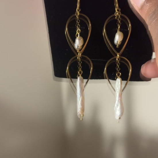 Gold-tone dangle earrings featuring layered open shapes with genuine freshwater pearls. Each earring includes a small round pearl and a baroque pearl drop connected by a fine chain for soft movement. Lightweight and versatile for everyday wear or special occasions.